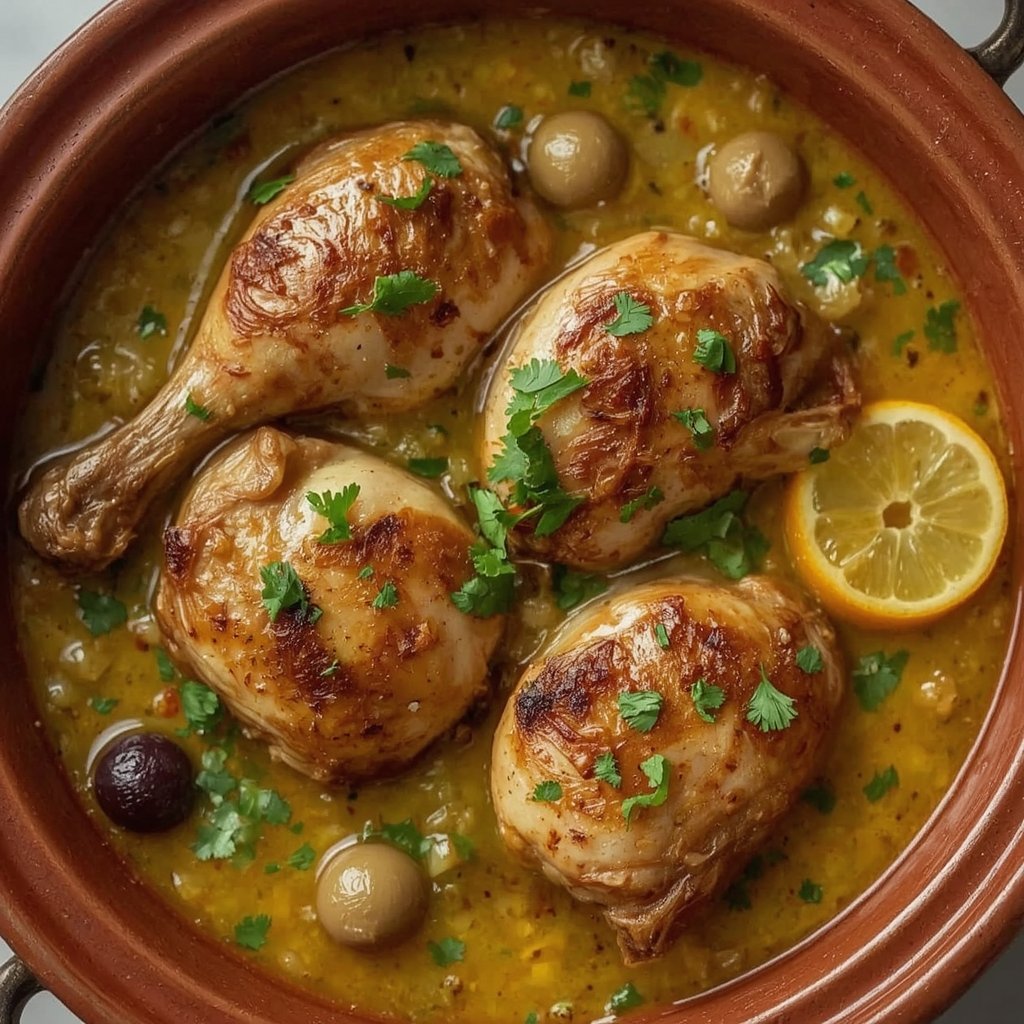 Die Hühnchen-Tajine mit eingelegten Zitronen und Oliven ist ein Klassiker der marokkanischen Küche. Die Kombination aus herzhaften Gewürzen (Ingwer, Kurkuma, Safran), der leichten Schärfe von Oliven und der unverwechselbaren, salzigen Säure der eingelegten Zitronen schafft ein einzigartiges und tiefes Geschmacksprofil. Das Hähnchen wird durch das langsame Garen unglaublich zart und saftig.