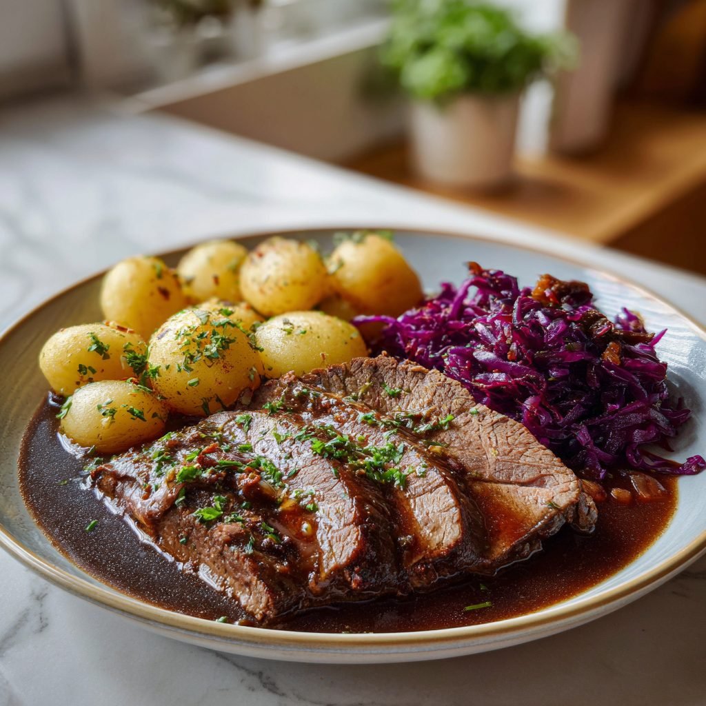 Der Sauerbraten hat eine lange Geschichte, die bis ins antike Rom zurückreicht, wo Fleisch in sauren Marinaden haltbar gemacht wurde. In Deutschland wurde er im Mittelalter populär, als man feststellte, dass durch die saure Marinade auch zähere Fleischstücke zart und schmackhaft wurden. Die bayerische Variante unterscheidet sich von der rheinischen durch die Verwendung von Lebkuchengewürz und manchmal auch Wein in der Marinade (hier durch Traubensaft ersetzt). Es war traditionell ein Sonntags- oder Festtagsgericht, das für große Familienfeiern zubereitet wurde. In vielen bayerischen Gasthöfen ist er noch heute die Spezialität. Das Rezept symbolisiert die deutsche Kochkunst des Schmorens und die Kunst, mit Zeit und einfachen Zutaten großartigen Geschmack zu entwickeln. Jede Familie hat ihr eigenes, geheimes Rezept für die Marinade.