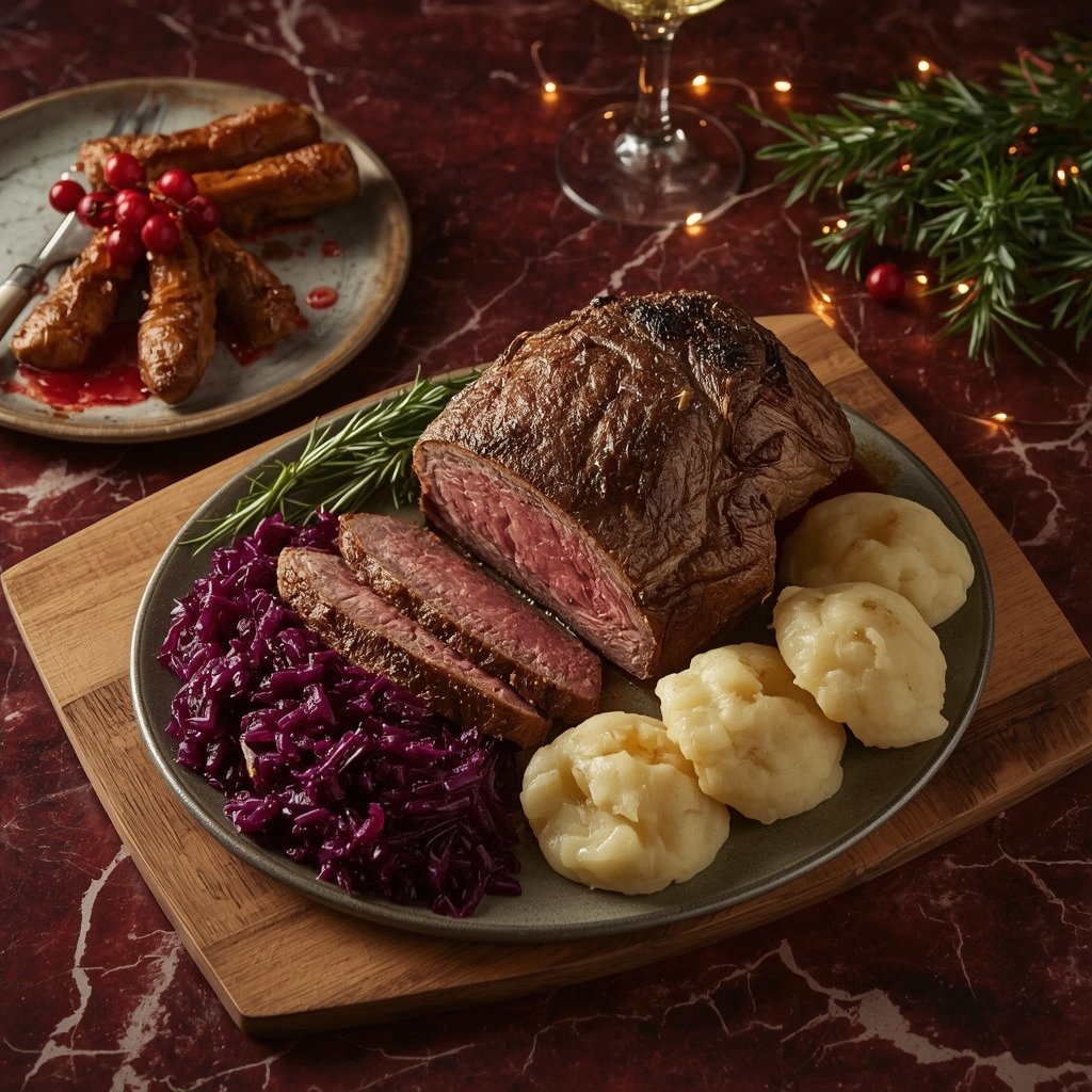 Dieser festliche Rinderbraten ist das Herzstück eines traditionellen Weihnachtsessens. Langsam im Ofen gegart, entwickelt das Rindfleisch eine unglaubliche Zartheit und ein tiefes Aroma, das perfekt zum süß-sauren Rotkohl und den fluffigen Kartoffelklößen passt. Ein Gericht, das nicht nur den Magen, sondern auch das Herz wärmt und Weihnachtsstimmung verbreitet. 🍽️ Ein Blick in die Geschichte des Gerichts Der Sonntagsbraten hat in Deutschland eine lange Tradition und wird zu besonderen Anlässen wie Weihnachten zelebriert. Diese festliche Variante mit Rotkohl und Klößen symbolisiert deutsche Weihnachtstraditionen über Generationen hinweg. ⏱️ Rezeptübersicht Vorbereitungszeit: 30 Minuten Kochzeit: 2 Stunden Portionen: 8 🛒 Zutaten für das perfekte …