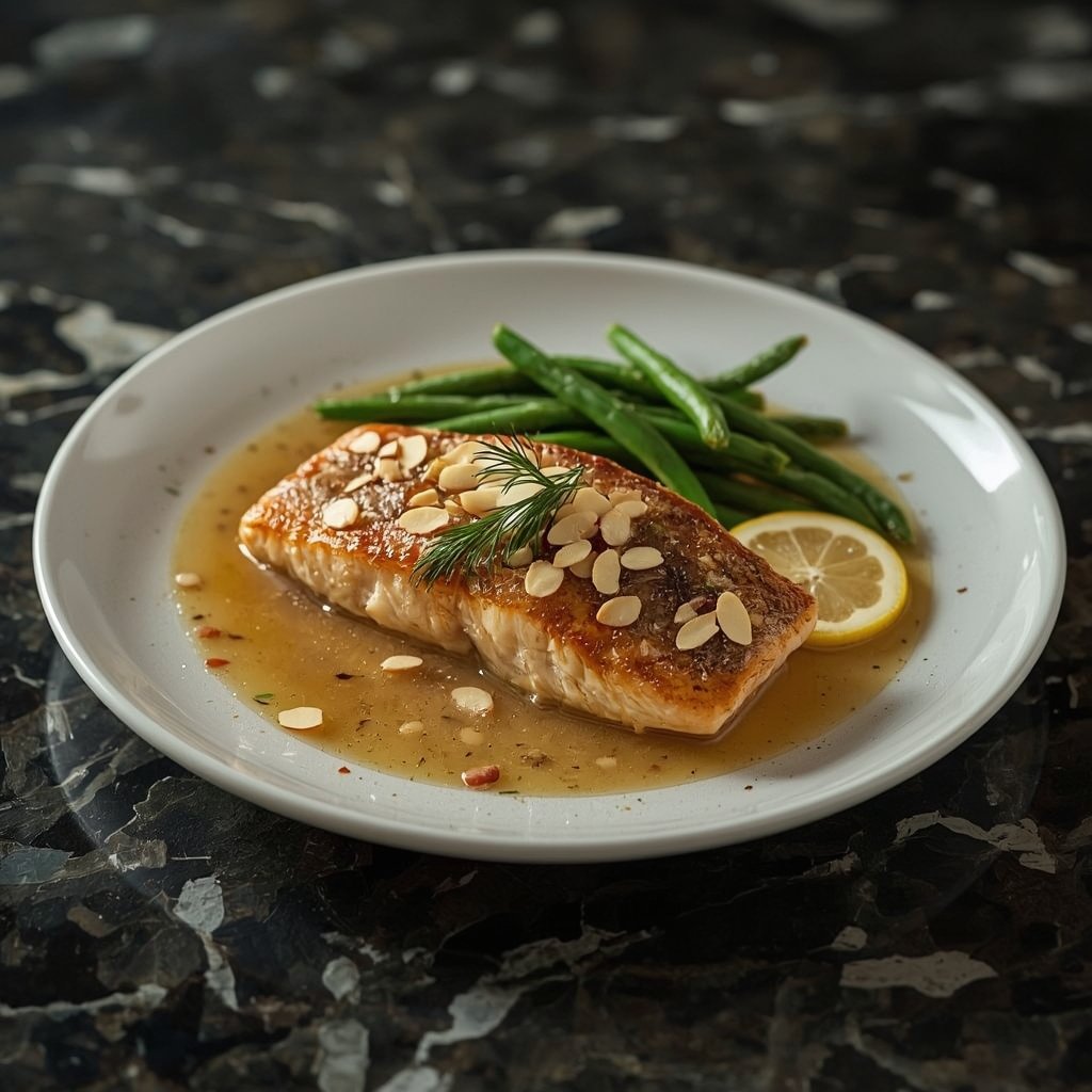 Forelle in Mandelbutter mit Zitrone und grünen Bohnen