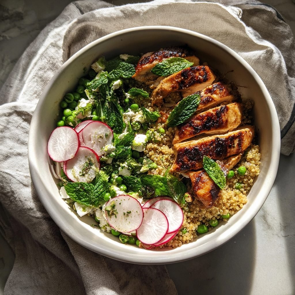 Frühlings-Hähnchen-Quinoa Schale mit Erbsen und Minze