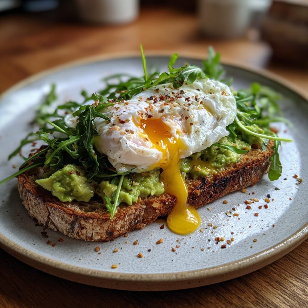 Avocado-Toast ist aus der modernen Frühstückskultur nicht mehr wegzudenken. Diese Version hebt das Gericht auf ein neues Level: cremiges Avocadomus auf knusprigem Sauerteigbrot, gekrönt von einem perfekt pochierten Ei mit flüssigem Dotter und einer Handvoll frischem, pfeffrigem Rucola. Ein schnelles, nährstoffreiches Power-Frühstück.
