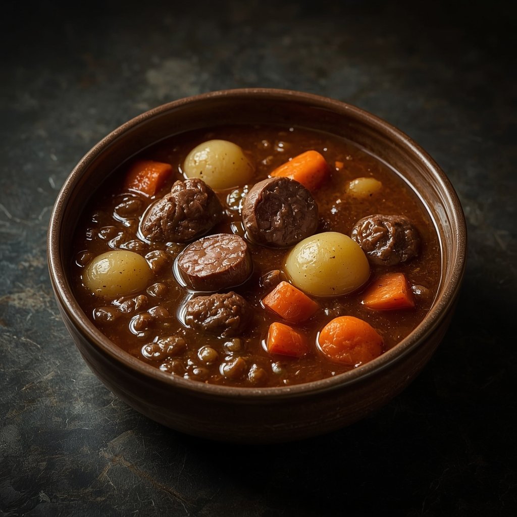 - Rinderwürstchen in Scheiben schneiden und in den Eintopf geben, kurz erwärmen.