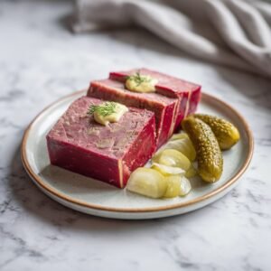 Sauerfleisch ist ein norddeutsches Traditionsgericht, das früher zur Haltbarmachung von Fleisch diente. Mageres Rindfleisch wird in einem kräftigen Essig-Sud mit Zwiebeln, Lorbeer, Nelken und Pfefferkörnern gegart, bis es zart ist, und dann in der eigenen Brühe mit Gelatine kalt gestellt. Serviert wird es in Scheiben geschnitten mit Zwiebeln, Gewürzgurken und Remoulade – ein erfrischendes, säuerliches Gericht, das besonders im Sommer beliebt ist.