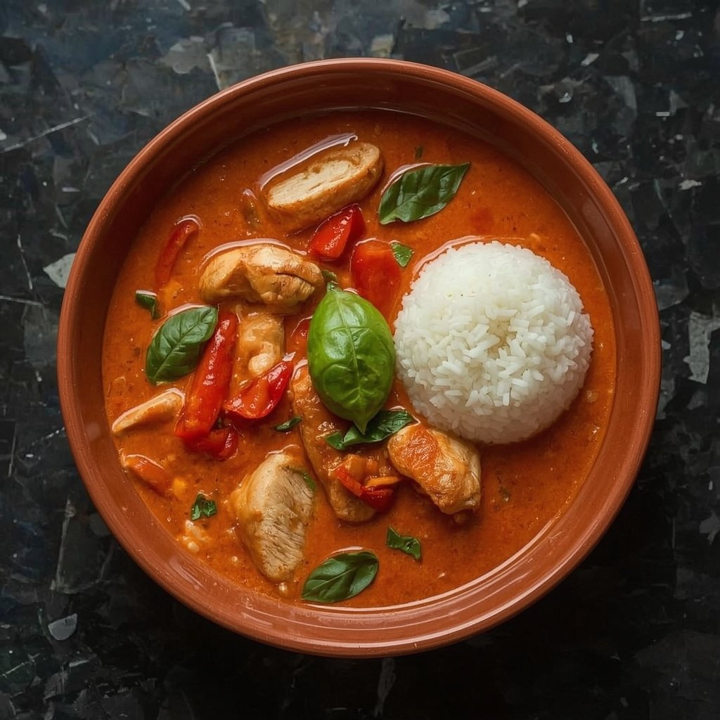 Dieses Rote Thai-Curry ist ein echter Blitz-Klassiker, der schnell zubereitet ist und voller Geschmack steckt. Die cremige Kokosmilch fängt die Schärfe der roten Currypaste auf, während frische Hähnchenstreifen und knackiges Gemüse wie Paprika und Bambussprossen für Abwechslung sorgen. Ein einfaches, sättigendes Gericht. Schwierigkeit: Einfach.