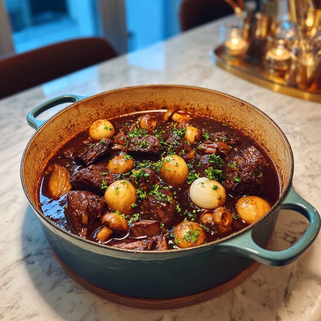 Boeuf Bourguignon ist das berühmteste Schmorgericht Frankreichs. Diese Version ersetzt den Rotwein durch eine intensive Kombination von dunkler Rinderbrühe, Tomatenmark und Gewürzen, ohne den tiefen, komplexen Geschmack zu verlieren. Butterzartes Fleisch in einer samtigen Soße.