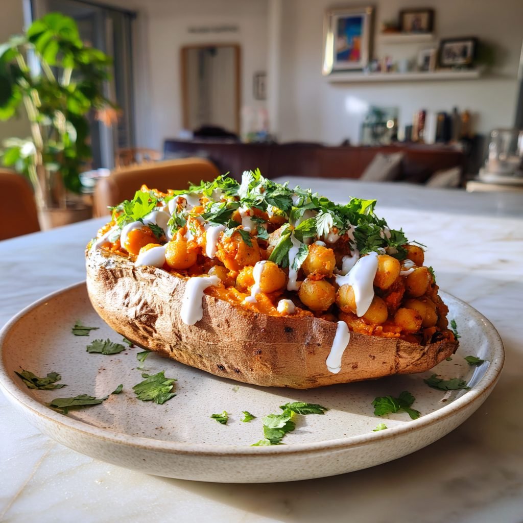 Diese gefüllten Süßkartoffeln sind ein wahres Superfood-Mahl! Süßkartoffeln aus dem Ofen werden mit einem aromatischen Kichererbsen-Curry gefüllt und mit frischem Koriander und einem cremigen Joghurt-Topping abgerundet. Vegan, gesund und unglaublich befriedigend.