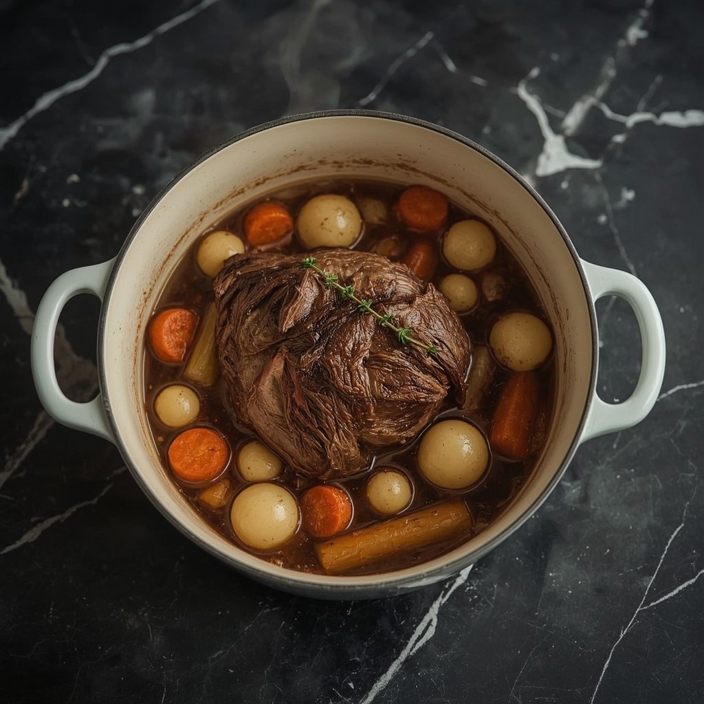 Das Fleisch schmeckt am nächsten Tag noch besser, wenn die Aromen durchgezogen sind. Verwenden Sie einen gut schließenden Bräter für optimale Ergebnisse.
