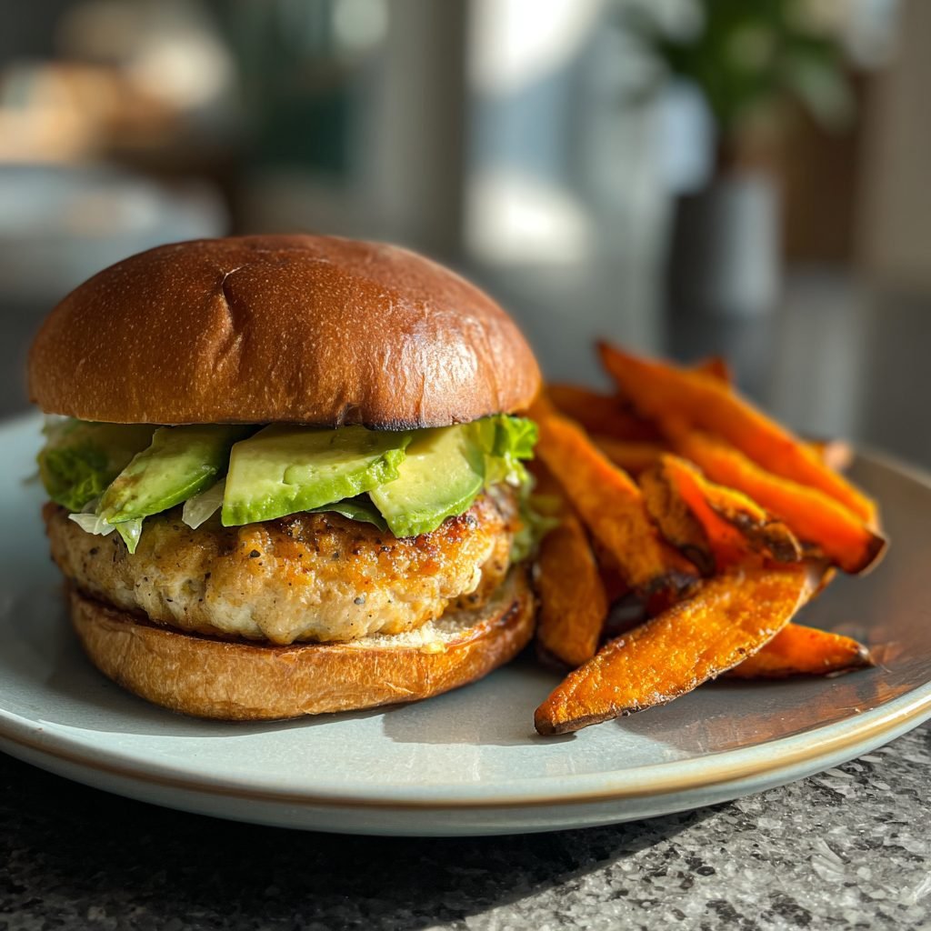 Wer sagt, dass Fast Food ungesund sein muss? Dieser Hähnchen-Burger kombiniert ein saftiges Hähnchenpatty mit cremiger Avocado und knackigem Salat in einem weichen Brioche-Brötchen. Dazu selbstgemachte Süßkartoffel-Pommes für den ultimativen Genuss.