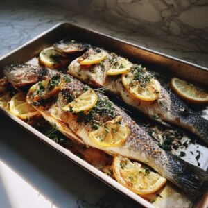 5. Sofort mit der Kräutersauce und Zitronenspalten servieren.