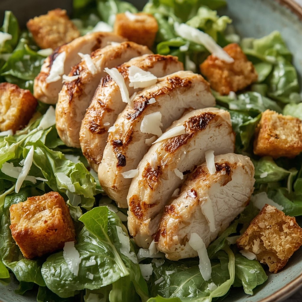 - Salatblätter mit Dressing, Croûtons und Parmesan vermischen. Die Hähnchenscheiben darauf anrichten und sofort servieren.