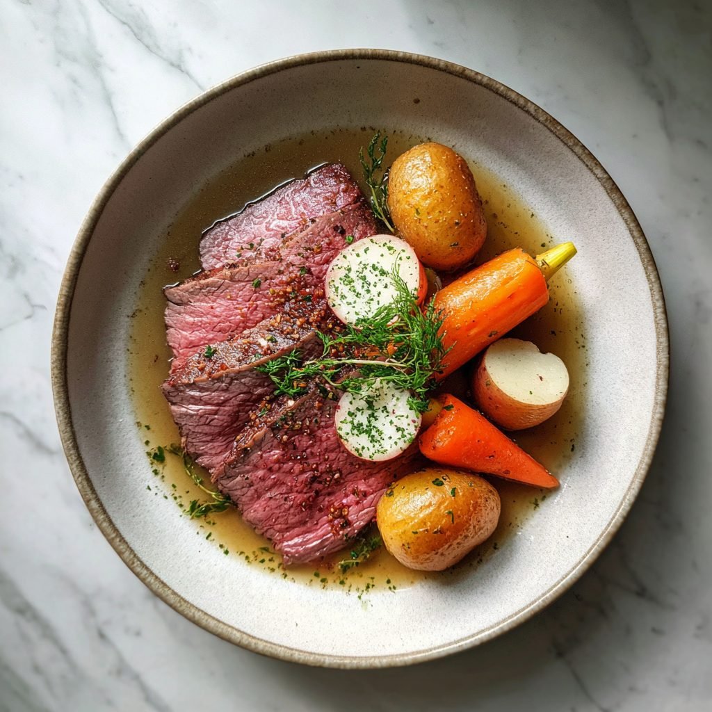 Verwenden Sie hochwertiges Rindfleisch von einem Metzger. Die Brühe nicht zu stark kochen, damit sie klar bleibt. Tafelspitz schmeckt auch kalt als Aufschnitt.