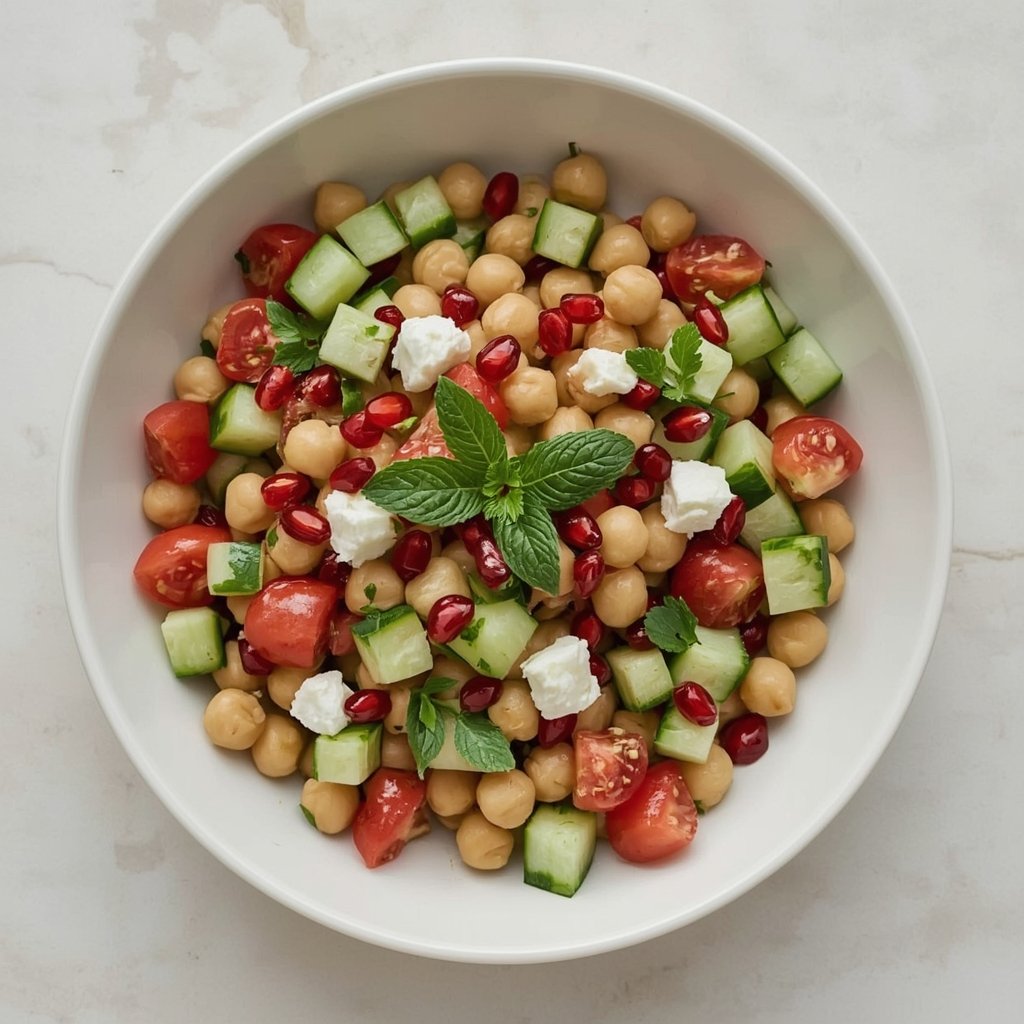 Dieser orientalische Kichererbsen-Salat ist eine wahre Geschmacksexplosion: Er ist proteinreich, vegan (oder vegetarisch mit Feta) und vollgepackt mit frischen Aromen. Das zitronige Dressing, die frische Minze und die süß-sauren Granatapfelkerne machen diesen Salat zu einem perfekten, leichten Mittagessen oder einer sättigenden Beilage.