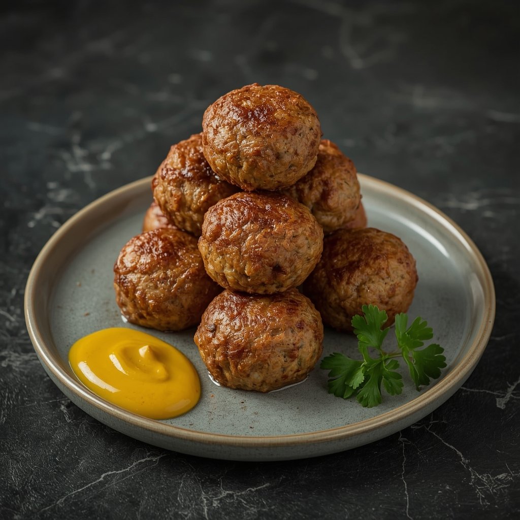 - Hackfleisch mit Brötchen, Zwiebeln, Ei, Senf, gehackter Petersilie und Gewürzen verkneten.