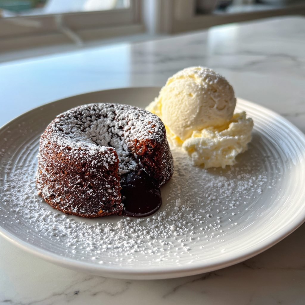 Servieren Sie die Kuchen sofort aus dem Ofen mit einer Kugel Vanilleeis oder Schlagsahne. Perfekt für ein besonderes Dessert.