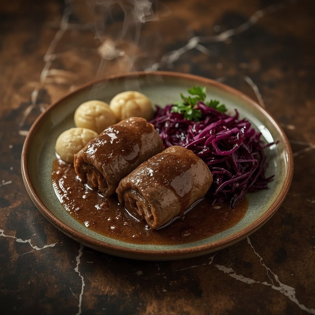 Die traditionelle Rinderroulade ist der Inbegriff deutscher Hausmannskost. Zarte Rindfleischscheiben, gefüllt mit Rinderbacon, Zwiebeln und Gurken, in einer reichhaltigen Soße geschmort – dieses Gericht ist ein zeitloser Klassiker. Diese verzichtet auf Schweinefleisch und Alkohol, ohne an Geschmack zu verlieren.
