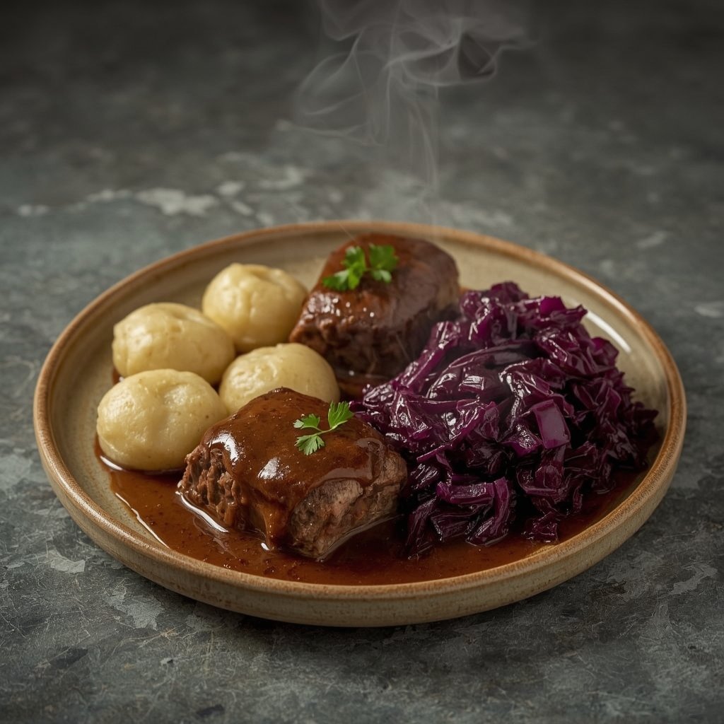 Die traditionelle Rinderroulade ist der Inbegriff deutscher Hausmannskost. Zarte Rindfleischscheiben, gefüllt mit Rinderbacon, Zwiebeln und Gurken, in einer reichhaltigen Soße geschmort – dieses Gericht ist ein zeitloser Klassiker. Diese verzichtet auf Schweinefleisch und Alkohol, ohne an Geschmack zu verlieren.