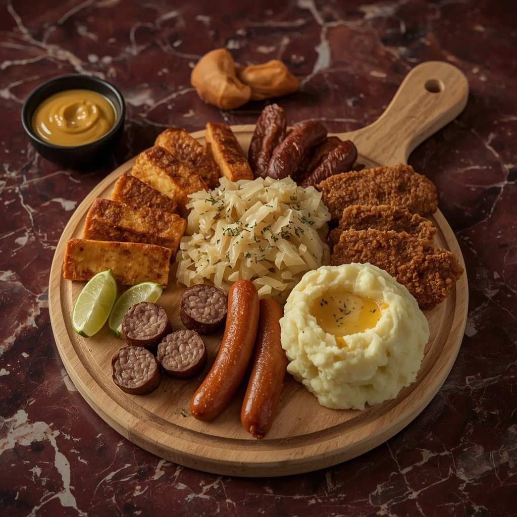 6. Alles anrichten: Püree, Sauerkraut, Tofu, Seitan und Würstchen auf einer großen Platte oder einzelnen Tellern servieren. Mit Soße und Senf dazu reichen.